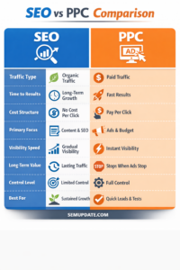 SEO and PPC are the two main components of Search Engine Marketing (SEM). SEO focuses on improving a website’s visibility in organic search results, while PPC involves paying for advertisements that appear in search engines. Both strategies help businesses attract visitors from search engines, but they work in different ways and offer different advantages.